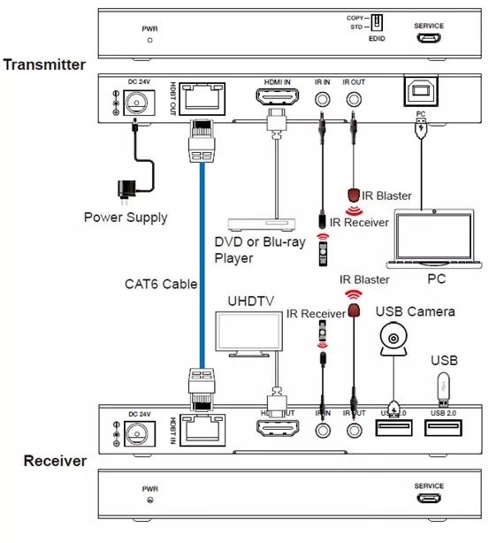 5. Connection diagram for 18Gbps HDBaseT HDMI2.0 150 meters 4KX2K@60Hz Extender with USB 2.0: